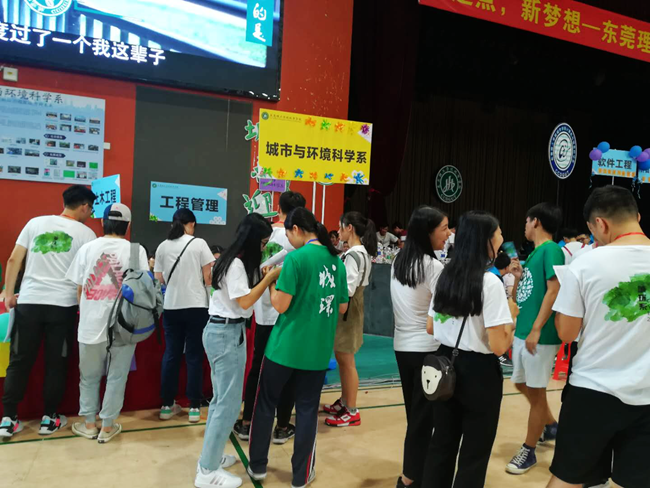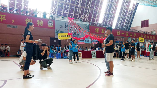 在综合馆内,有一支身着黑色上衣、扛着相机与kt板的队伍引来不少人的关注。他们是华硕合伙人组成的公益服务队,帮助新生定格与城院的第一张合照。