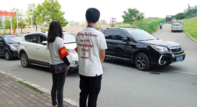 “我们从7点半就开始在这里指挥交通,到现在已经8个小时了。刚刚虽然发生了小事故,但是在协调之下也圆满解决了。这对我们来说很欣慰,看到新同学来报到也很开心。”一位交通指挥志愿者微笑着说道。