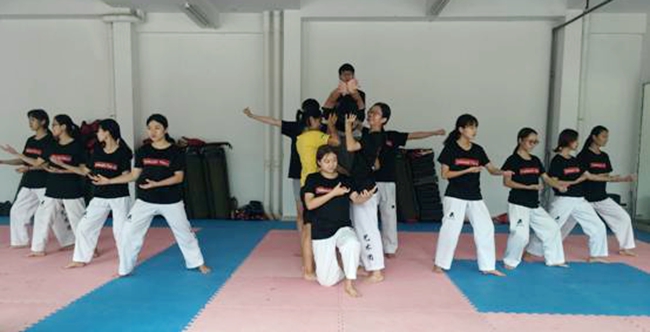 在学7宿舍楼后面,有一群人为新生做着别样的工作。这是艺术团跆拳道队的小伙伴们努力排练要送给新生的演出节目。
