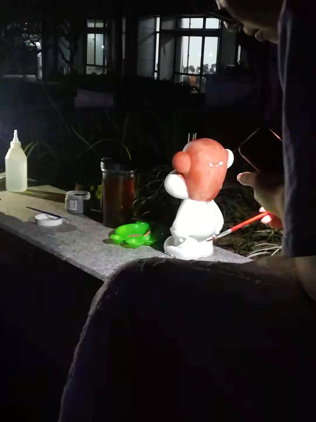 一排可爱的石膏娃娃放在石凳之上,而她正用手中砖红色的画笔为其上色。一勾一画,自带风流。勾出人们对美的渴望,画出她心中对美的看法。看她专注的背影,似乎是在给同学们传递出那似水一般的宁静。在今晚的工模现场上,翩然洋溢着一股“清流”之风。