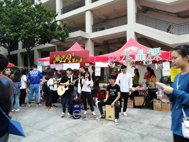 持续四天的工模,除了各式各样的美食,当然还有动听的歌声。刚开始只是其中一个小吃摊有两位女生在动情歌唱,引得同学们纷纷驻足,赢得了更多商机。不久,隔壁的摊位也不甘示弱,一个乐队也来助威,搬出了吉他、鼓等“武器”,声情并茂地演奏。两边的音乐交汇,引得更多人的观看,不时传出阵阵欢呼声,两头的歌手们也相视一笑。看来,合作才能创造更大的商机。(大学生实习记者 罗思琪)