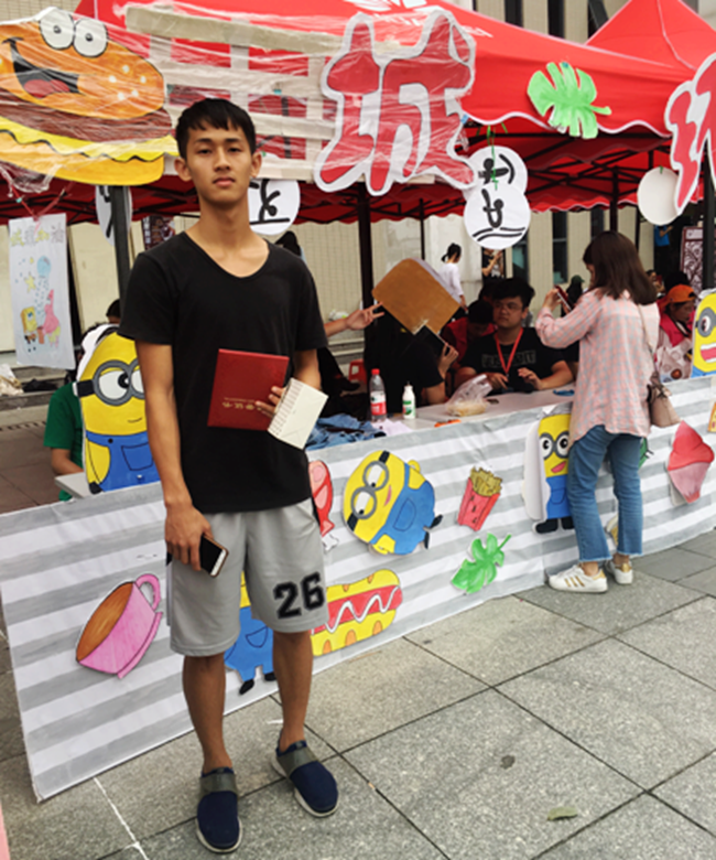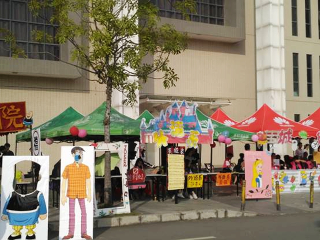 一张扑克牌、一座小城堡、一个爱丽丝公主的展板吸引住记者的眼球。在一个个红色帐篷的中间有一“点”绿——外语系大本营,虽然没有其他院系的鲜艳和豪华,但是这充满童话氛围而简约的风格同样也能让人眼前一亮,同时也符合外语系青春飞扬的特点。这些装饰物均由外语系宣传部的小伙伴们耗费大量时间手工绘制而成,为幕后的工作人员们点赞!(大学生实习记者 黄燕菲)