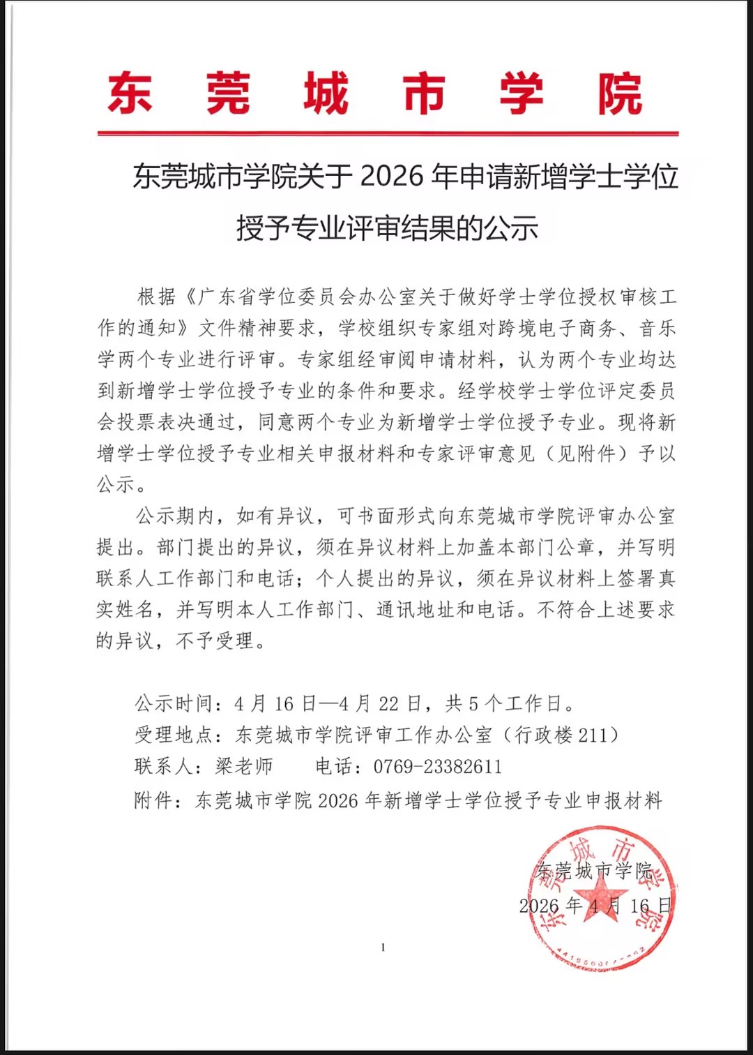 东莞城市学院关于2026年申请新增学士学位授予专业评审结果的公示