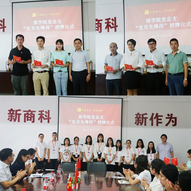 商学院党总支分别为荣获“管理先锋岗”、“科研先锋岗”、“教学先锋岗”和“服务先锋岗”的教师党员以及荣获“学生先锋岗”的学生党员进行了授牌。