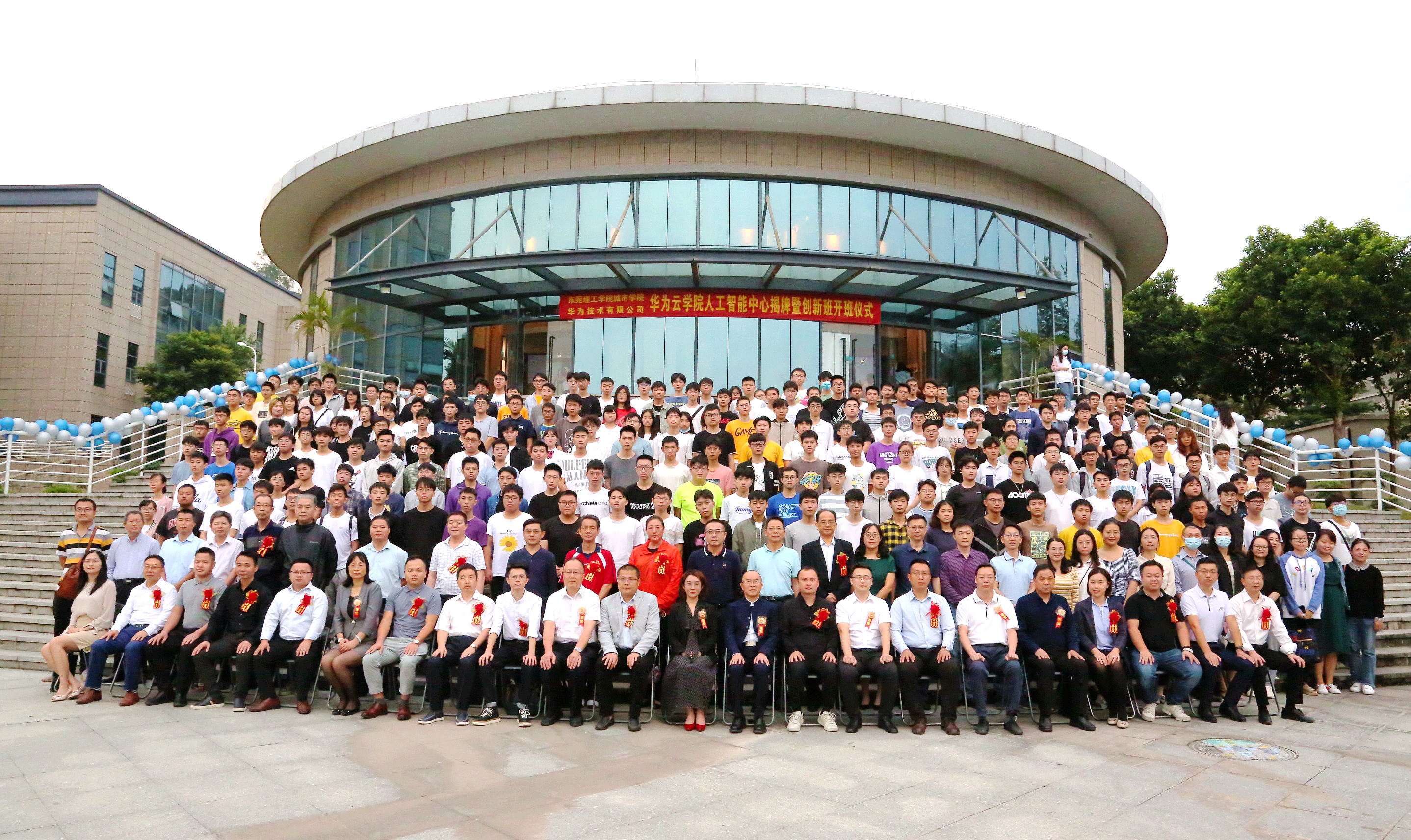 大会上,姜琳处长、孟令金总监、钟锦辉董事长、陈超群总经理、王卫平校长、牛熠院长等领导共同为“华为云学院人工智能中心”揭了牌,并为“华为创新班”开班剪了彩,共同预祝学校和华为合作取得佳绩。