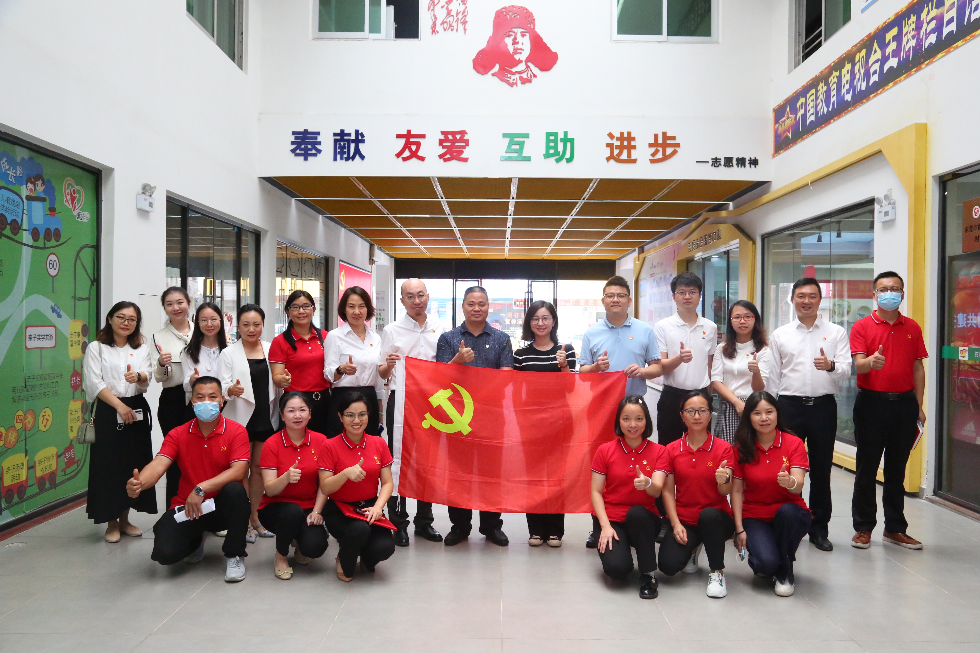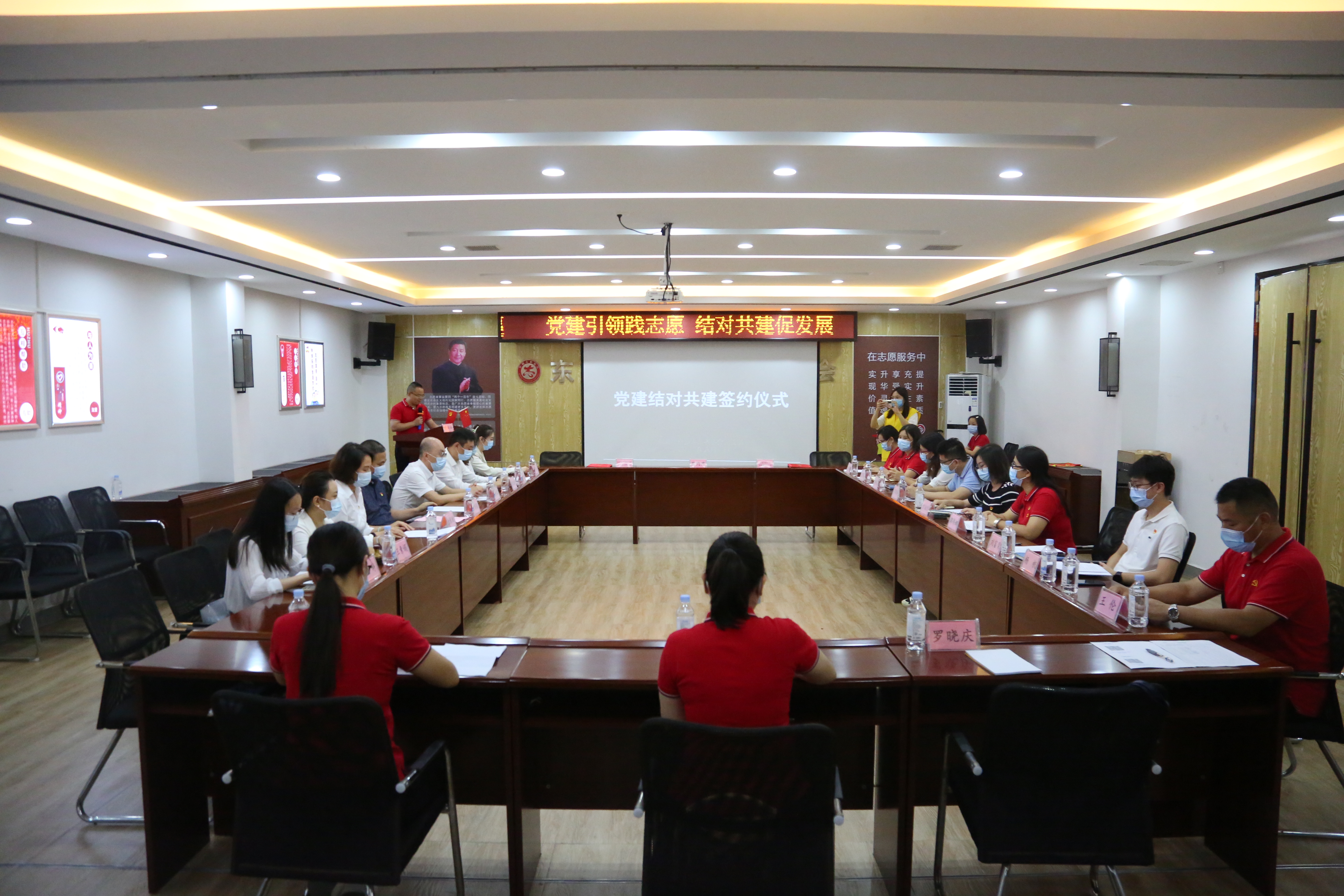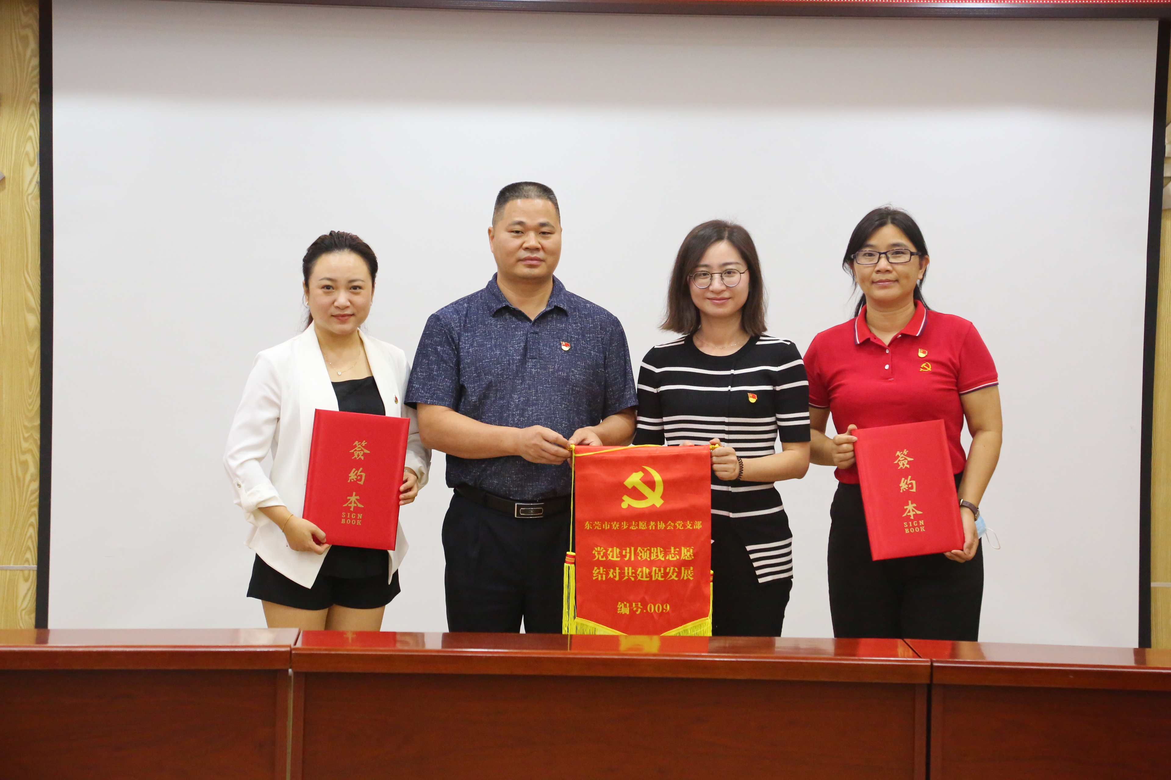 艺术学院教工党支部书记王素娟与寮步志愿者协会党支部书记郭伟娜为代表进行共建协议签订,孔增强与方淑欣为结对签约双方党支部授旗。