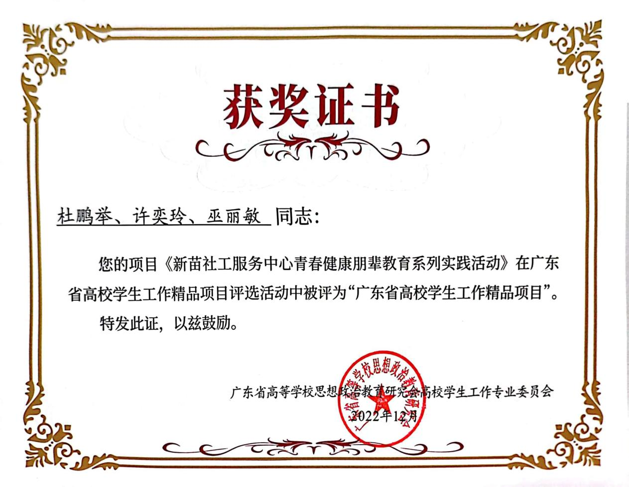 我校《新苗社工服务中心青春健康朋辈教育系列实践活动》项目,成功获评2022年“广东省高校学生工作精品项目”。