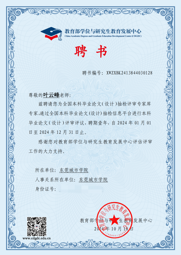 为了加强和改进教育督导评估监测,保证本科人才培养基本质量,2022年8月,教育部首次面向全国高校开展2022年度本科毕业论文(设计)抽检和专家库建设工作。根据《关于做好全国本科毕业论文(设计)抽检信息平台和专家库建设工作的通知》(学位中心函〔2022〕4号)等文件要求,近日,教育部学位与研究生教育发展中心(简称教育部学位中心)向我校新传媒与艺术学院教师,品牌与招生部负责人叶云峰副研究员颁发“全国本科毕业论文(设计)抽检评审专家库专家”聘书(编号:XWZXBK2413844030128)。