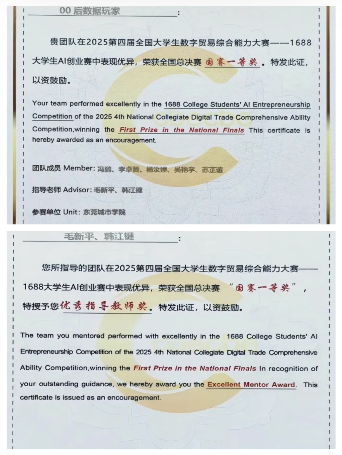 我校商学院有4支参赛队伍成功闯进本次决赛,9月27日,在陈孔艳老师的带队下,凭借扎实的专业功底与出色的创新能力,在阿里巴巴1688 大学生 AI 创业赛道(大数据分析赛道)国赛舞台上斩获佳绩,荣获一等奖1项、二等奖2项、三等奖1项。由商学院数字经济系毛新平、陈孔艳、韩江键三位老师指导的“00后数据玩家”团队勇夺全国一等奖,荣获“1688银星奖”称号(全国第二),并获得主办方颁发的1万元奖金,是我校参赛以来的最好成绩,也是全国民办高校中获得的最好成绩。