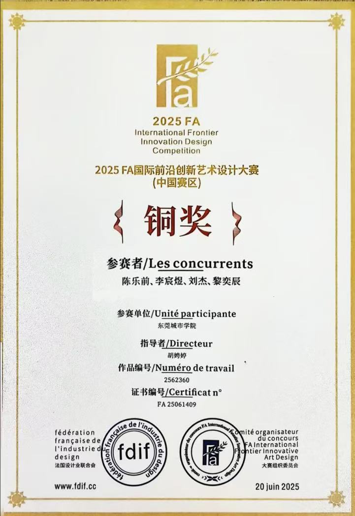 FA国际前沿创新艺术设计大赛是全球最具影响力与前瞻性的艺术设计赛事之一,竞争激烈,含金量十足。此次获奖不仅是对同学们专业能力的充分肯定,也是我校跨学科教学成果的重要体现。让我们向获奖同学及老师表示热烈祝贺!期待全院师再接再厉,在更多国际舞台上展现城建与智造学院的风采!