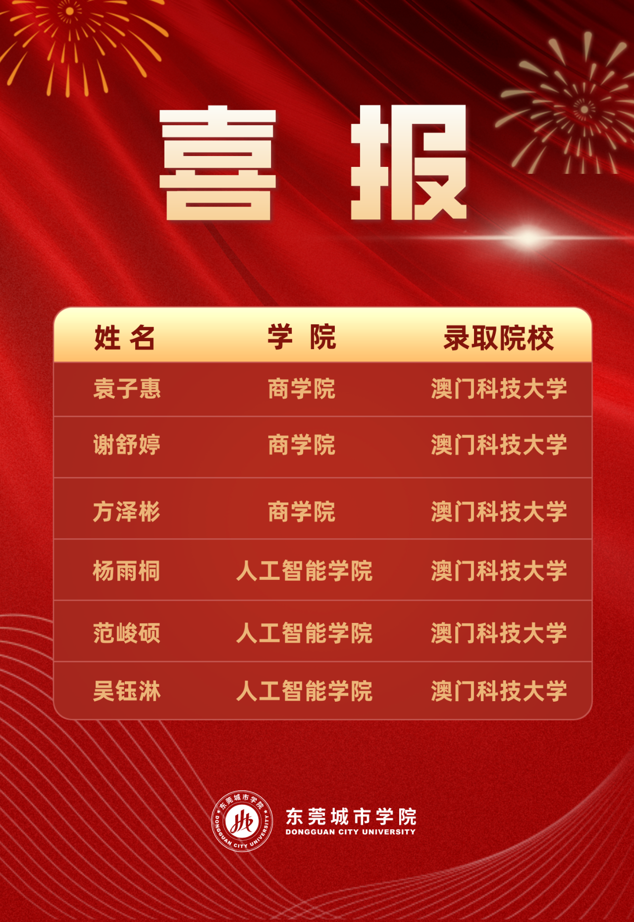 近日,东莞城市学院喜报频传,来自商学院与人工智能学院的6名优秀学子,凭借扎实的专业功底与出色的综合素养,成功获得澳门科技大学硕士研究生录取资格,充分展现了我校国际化人才培养的显著成效。