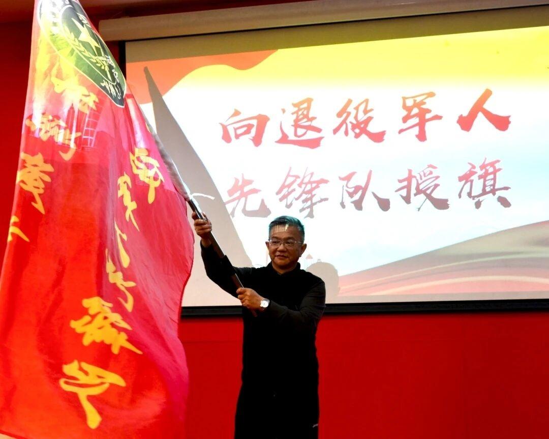 副校长康贤刚为退役军人先锋队授旗,鲜红队旗飘扬,标志着我校退役军人服务校园、引领青年的新平台正式启用。