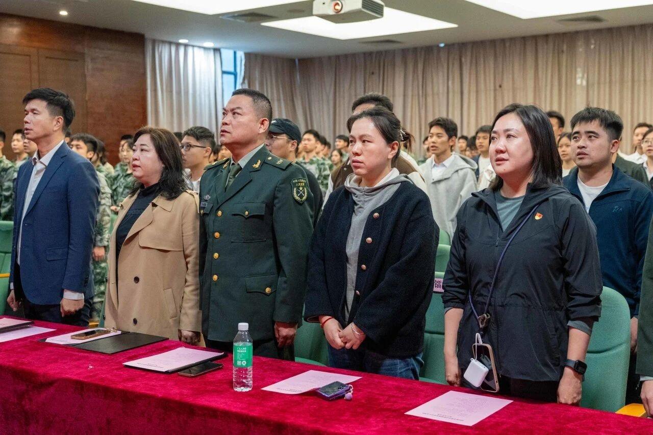 强化校园国防教育建设,凝聚青年爱国力量,11月27日下午,我校在行政楼112隆重举行国防教育教导团整编暨退役军人先锋队成立大会。党委书记魏东初、副校长康贤刚出席本次会议,武装部部长林蓉、武装部副部长刘维仝、团委书记范琪、武装部干事陈路标、欧俊杰,以及各二级学院党总支书记、负责征兵工作的辅导员、教导团和退役军人先锋队全体成员共同参会,齐聚见证校园国防教育发展的重要时刻。本次会议由高铭阳、许雯婷主持。