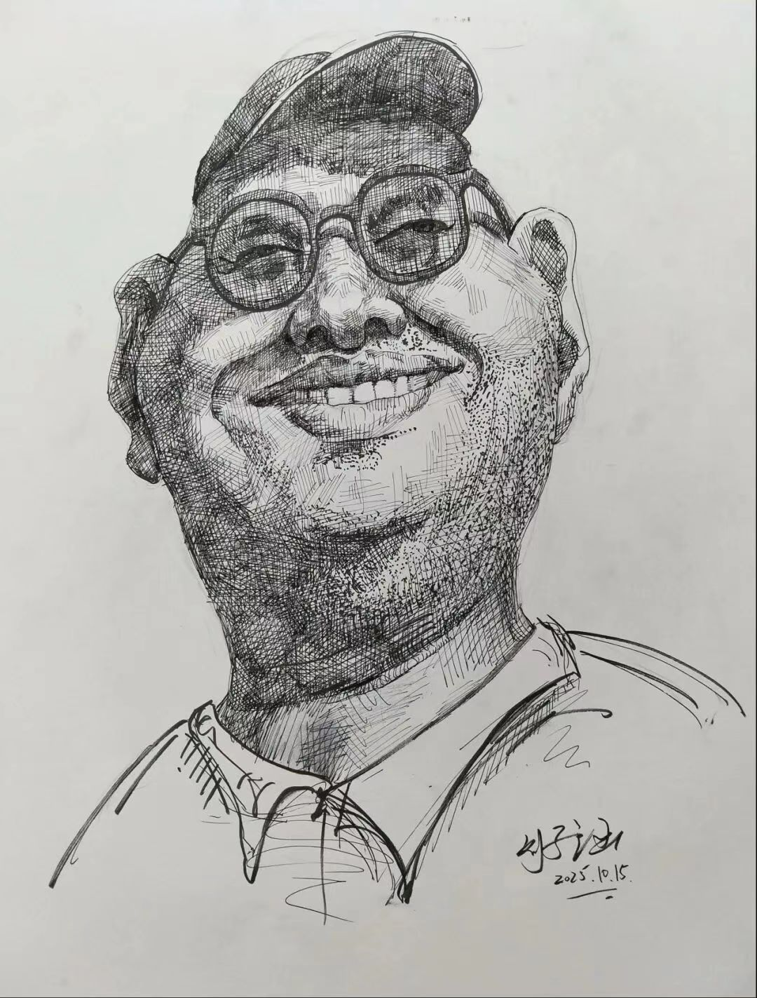 这是一幅有关生活感漫画肖像设计,以钢笔画形式排线构建面部肌理,通过夸张放大的笑眼、舒展的嘴角,强化人物松弛的情绪张力;硬质线条勾勒的帽檐、眼镜,与软质面部线条形成对比,既保留真实神态的烟火气,又以漫画化的形变让形象更具记忆点,实现“写实质感+夸张情绪”的风格平衡。