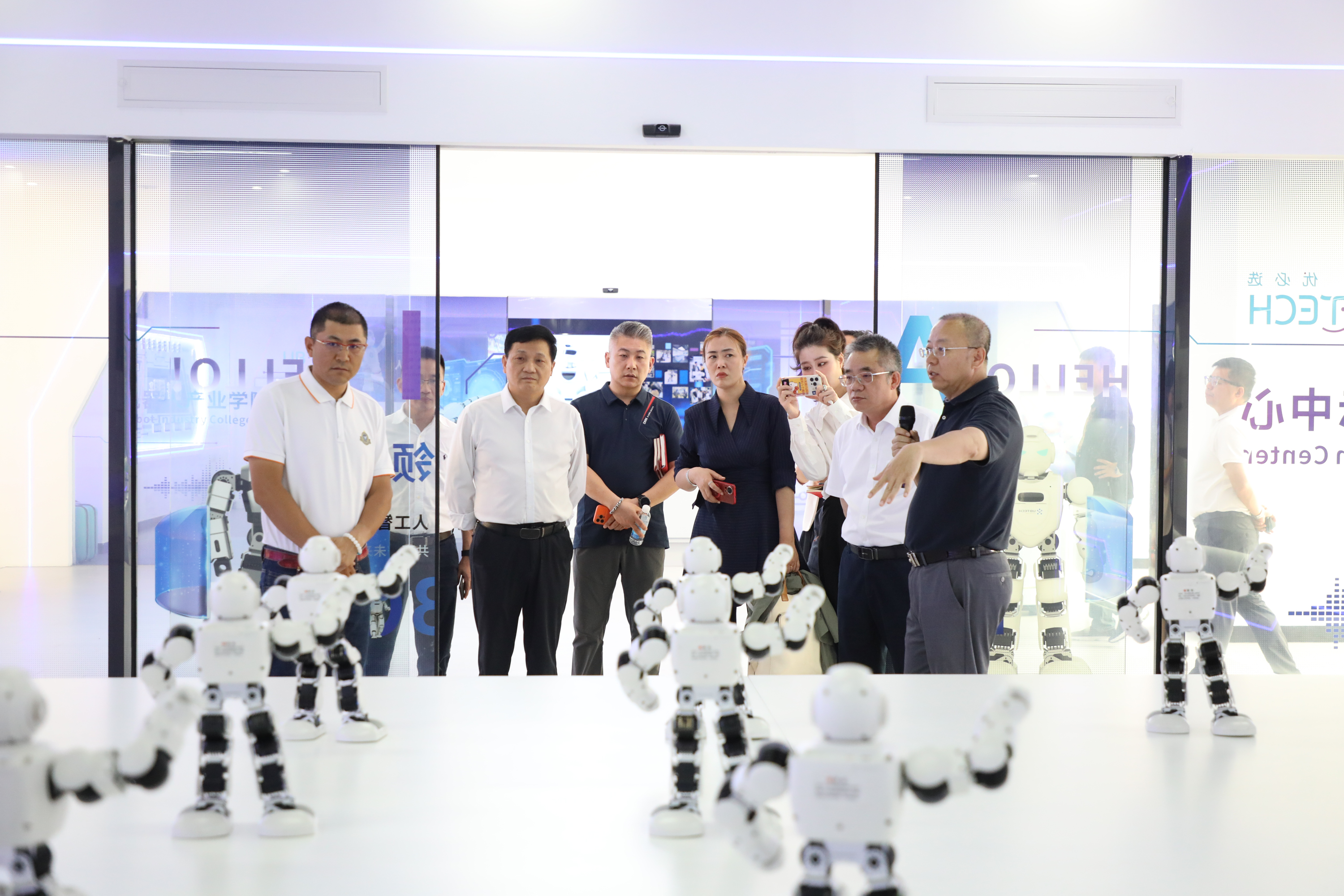 会前,来访嘉宾一行实地参观校园,先后走访优必选智能机器人产业学院等教学实训场所,详细了解学校办学条件、专业建设与产教融合成果。