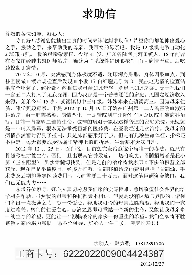 这是一封来自机电系郑力强同学的求助信。信中称其母患严重的疾病,急需一大笔钱诊治。望全院师生员工伸出热情之手,慷慨解囊,踊跃捐款,大献爱心。
