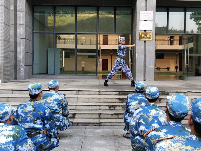 由机械制造及其自动化4班和机械电子工程1班组成的十七连三排,在陈教官的带领下,一遍遍重复着军体拳的动作,力求让自己身体的肌肉形成一种记忆。